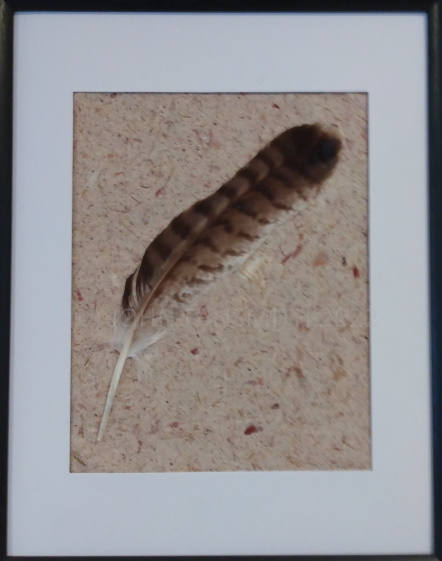 A lot of my work involves using found objects and recycled and repurposed materials. FEATHER is just such a piece using a molted feather from a broad tailed hawk and a sheet of handmade paper using asparagus and kale stems, corn husks, pineapple, day lily, and daffodil leaves, grass clippings and abaca. I have a large variety of handmade papers, and went through them all, but this combination really seemed to work best. FEATHER is a one of a kind piece because while I do have a couple more sheets of this particular paper, I found only the one feather. To the best of my knowledge, no hawk was harmed in the making of FEATHER.