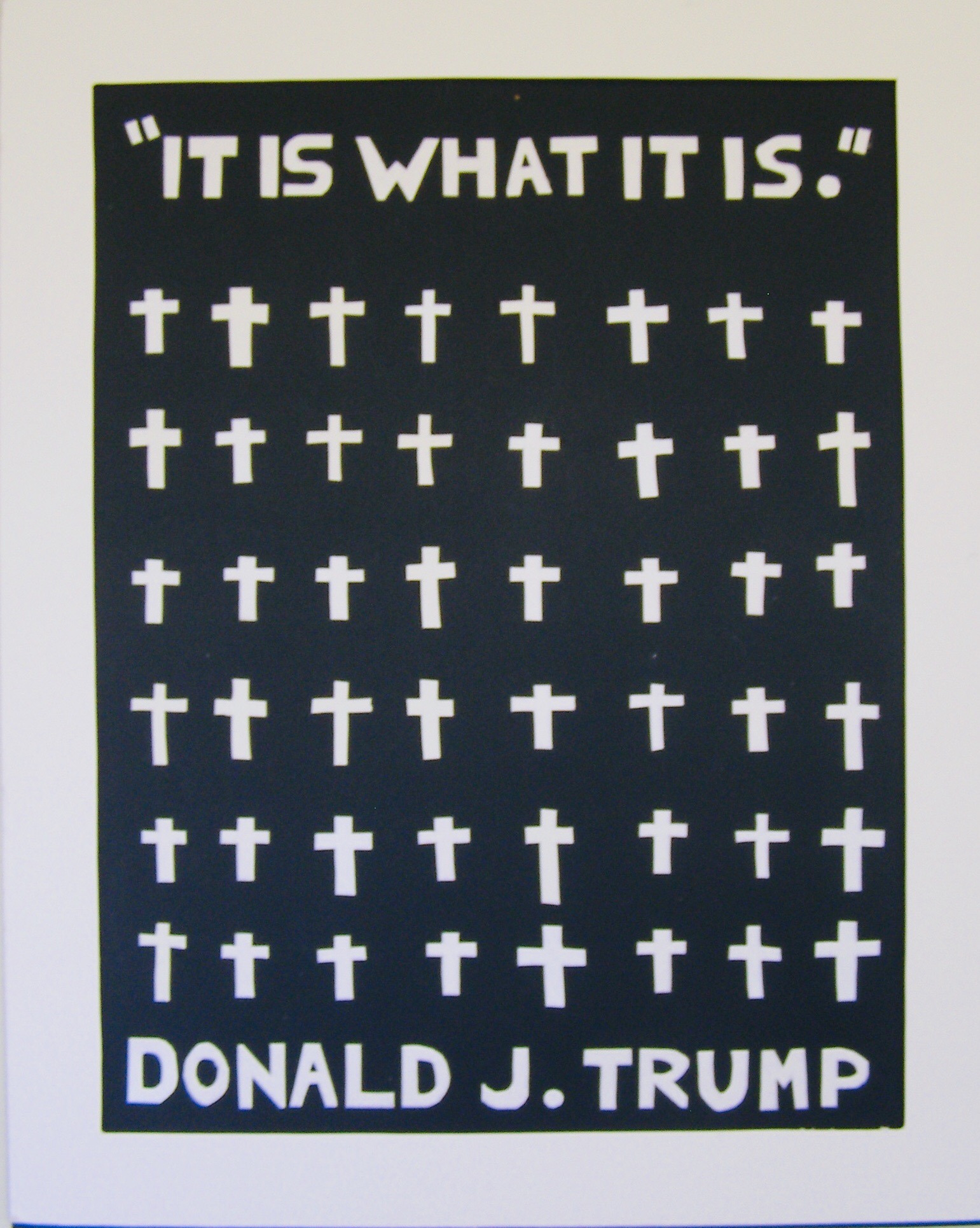 I’M DONALD J. TRUMP AND I APPROVED THIS MESSAGE is my reaction to his statement during the Axios interview about the number of COVID-19 deaths which at that time were running over 1000 per day with an aggregate of over 150,000. I was startled, not by his total lack of empathy that there was an individual life behind each one of those numbers; that I expected, but by his callous, off-handed dismissal of the numbers themselves encapsulated in the statement: “It is what it is”. It seemed that to him, both the lives lost and the numbers of them were irrelevant, or at most, inconvenient nuisances for his re-election campaign. My artistic problem was how to express this in a single visual image. I chose to put the statement into a campaign ad format complete with the required “approval language” and after several efforts (tombstones, different religious symbols, etc.) to combine it with the visual image set out in John McCrae’s iconic World War I poem In Flanders Fields: “In Flanders fields the poppies blow Between the crosses, row on row”. , but to vary the sizes and shapes of the crosses to recognize and honor the individuality behind each one. I’M DONALD J. TRUMP AND I APPROVED THIS MESSAGE is a white on black paper collage using recycled and repurposed advertising and packaging materials. (1307)) (2020) (20” x 16”) ($125)