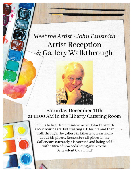 As part of my solo Exhibition and Sale at Ann’s Choice I will be giving an Artist Talk and Gallery Tour this coming Saturday, December 11th starting at 11:00am in the Catering Room located on the first floor of the Liberty Commons Clubhouse. It will then move to the Art Gallery on the second floor of the Liberty Commons Clubhouse at Ann’s Choice.
