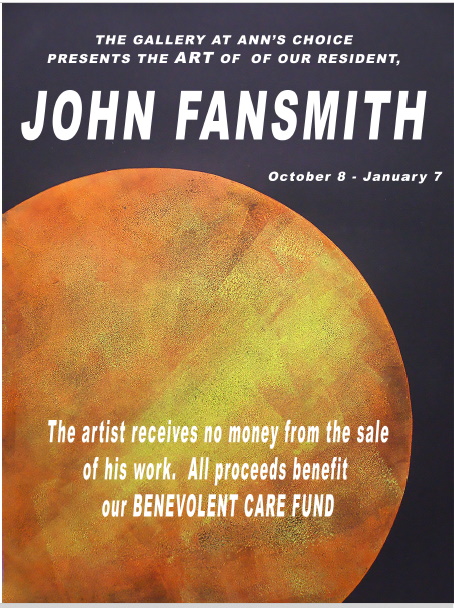 January 7th marked the end of my three month solo show at The Gallery at Ann’s Choice. The show was conducted as a fundraiser for the Benevolent Care Fund at Ann’s Choice and I am very pleased that twelve pieces in several different mediums were sold and that just under $2000 was raised. I would like to thank everyone who helped make it possible: to Sherry Resnick and the other members of the Ann’s Choice Art Gallery Committee who gave me the opportunity to exhibit my work; to my wife Susan and my daughter Alicia who helped curate and arrange the show: to Ann’s Choice Community Resources staff member Kenny Faunces who hung the two dimensional pieces and who, along with Chelsea Rounds, the Ann’s Choice Community TV Coordinator, did the publicity for the show; and of course to everyone who purchased a piece, gave it a good home, and helped me support the Benevolent Care Fund. Thank you.