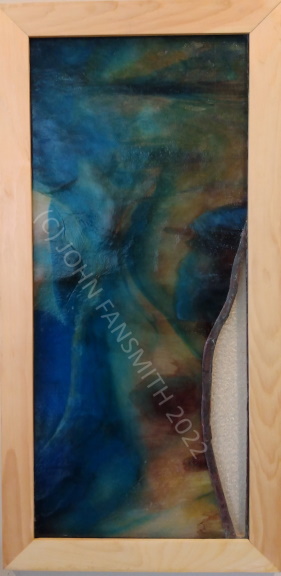 WOMAN IN BLUE is essentially a found object, a stunningly beautiful piece of stained glass that changes appearance as the light changes. It was donated to the Ann’s Choice Stained Glass Club because while beautiful it is also a very difficult piece of glass to work with. I picked it up, managed to trim most of the problems and decided to let the piece essentially speak for itself rather than pressing my luck. This is a piece in which everyone will see something different, but I have titled it WOMAN IN BLUE because I see a woman in left profile turning her head to the right, or at least that is what I see most of the time, and of course, blue is the predominate color. For this reason, I have chosen to emphasize the neckline on the right side by using a clear glass and a heavy solder line rather than trying to match the glass. I have enclosed it in a natural color pine hanging frame. (2022) (28 ½” x 15 ½”) ($350)