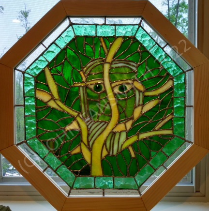 The mythology of the Green Man has continued to fascinate me and has been a recurring theme in my art in the form of prints, collages, cast cement, as well as two and three dimensional ceramic pieces. This version of THE GREEN MAN, however, is the first time I’ve depicted him in stained glass. Framed, my THE GREEN MAN, measures 19 1/2″ from top to bottom and side to side and contains 179 pieces of glass (each eye has three pieces of glass fused together). Because of the way the “attitude” of the piece changes as the light changes, this version may be my most interesting one yet. (2022)