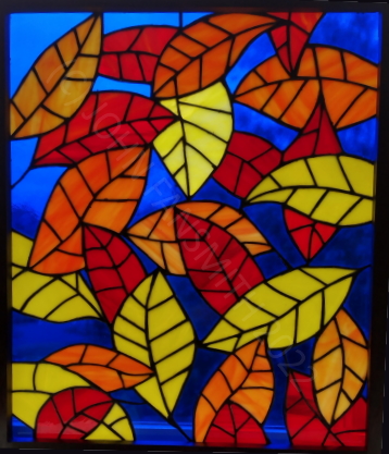 I am very pleased to be able to announce that my third major stained-glass piece this year, LEAF FALL, a commissioned piece, has been completed and accepted and is now part of a private collection in Elkins Park, PA. Like THE GREEN MAN and VORTEX, the design for LEAF FALL is an original design which seeks to convey a sense of motion, LEAF FALL was also designed to be displayed as either a wall hanging, or preferably, in a window and with no particular “right side”up. With the frame it is approximately 22”x 24” and is comprised of 198 pieces of individually cut and foiled glass in four different colors