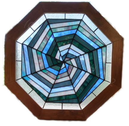 VORTEX is the second major originally designed and framed stained-glass panel I have completed this year at Ann’s Choice. Octagonally framed, it measures 23 ½” across and is comprised of 88 pieces of glass individually cut and foiled using 9 different types of stained glass. I built the frame from 1”x 3” pine specifically for VORTEX and can be displayed either as a wall hanging or, and preferably, in a window. When I was designing and constructing VORTEX, I was trying to capture a sense of movement – of being drawn into the center of the piece. (2022) ($750).