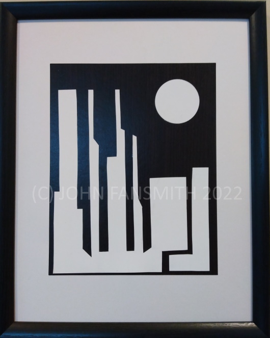 SNOW MOON is part of my “Negative to Positive” Series of paper collages which take the background color, i.e. the “negative space” from a single piece of advertising or packaging material and convert it into the image, i.e. the “positive”. In this case the material was a grocery delivery advertisement and the title SNOW MOON comes from the name of the February 2022 full moon. I knew that certain full moons had names, such as the Harvest Moon or the Hunter’s Moon but did not realize that all full moons have names until I started researching it.